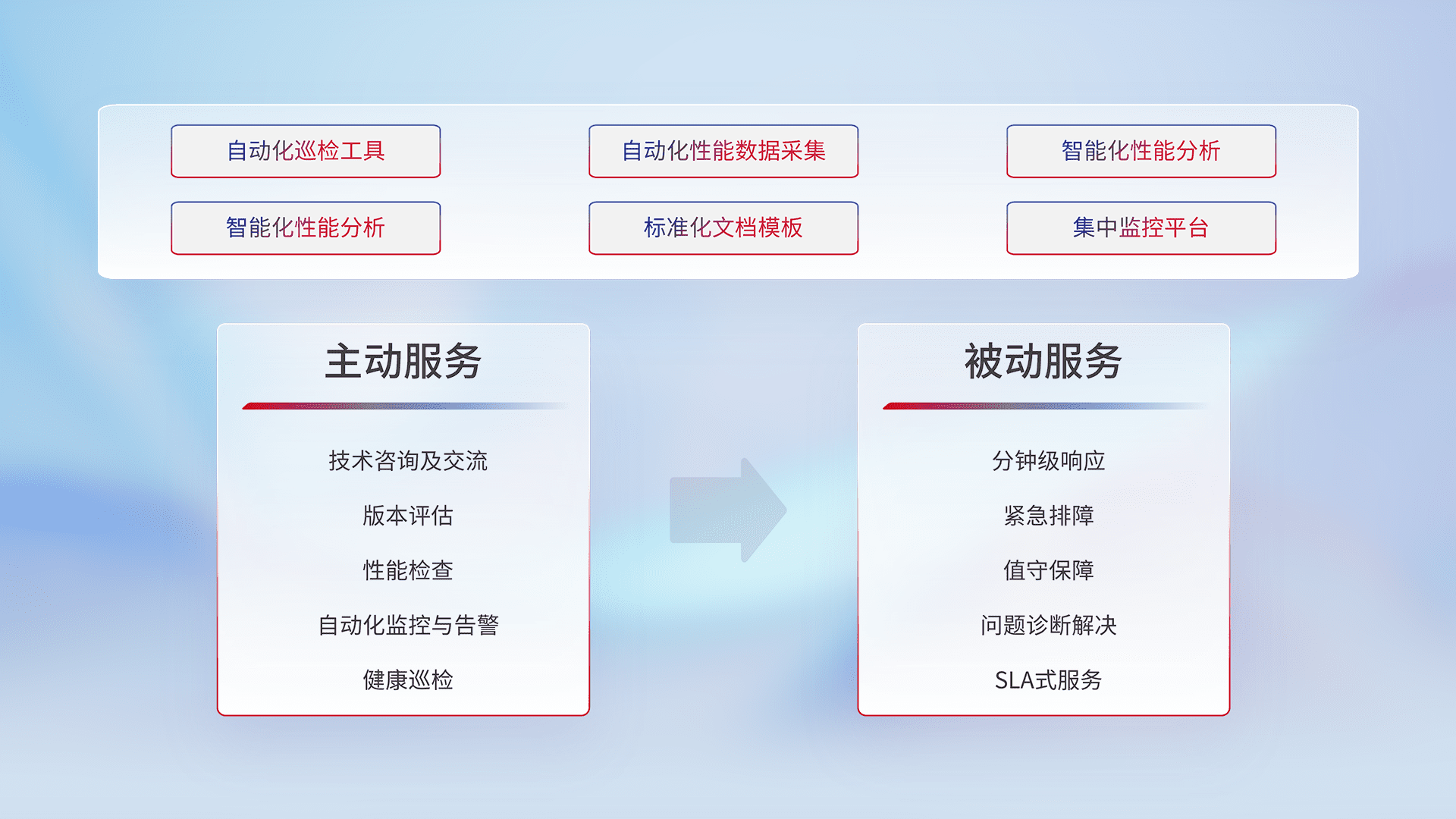智能化工具和标准化文档,,保障服务质量,,提供主动服务(包含技术咨询、、版本评估、、、、性能检查、、自动化监控与告警、、、、健康巡检)和被动服务包含(分钟级响应、、、紧急排障、、、、值守保障、、、问题诊断解决、、、SLA服务)。。
