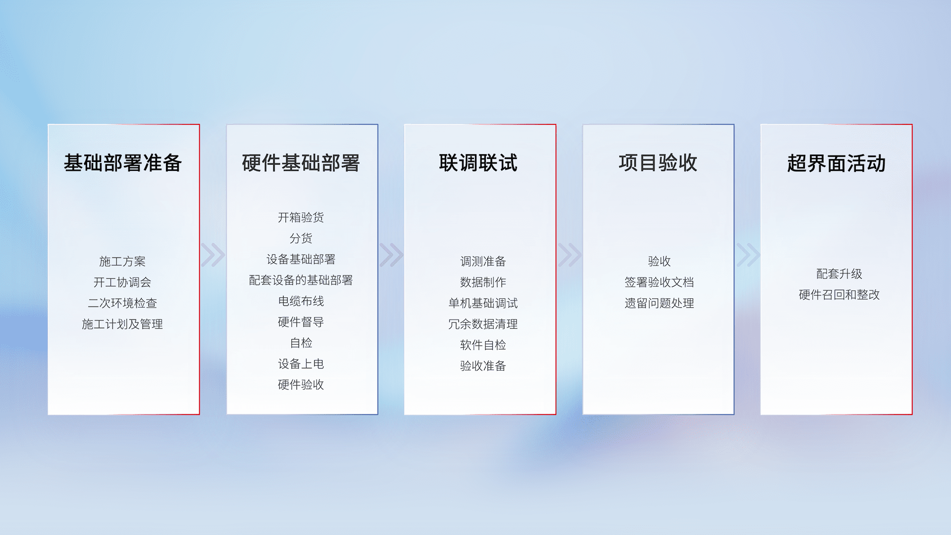 从基础部署准备、、、、硬件基础部署、、、、联调联试、、、项目验收、、越界面活动的全过程可追溯,,,,保证施工质量和进度。。